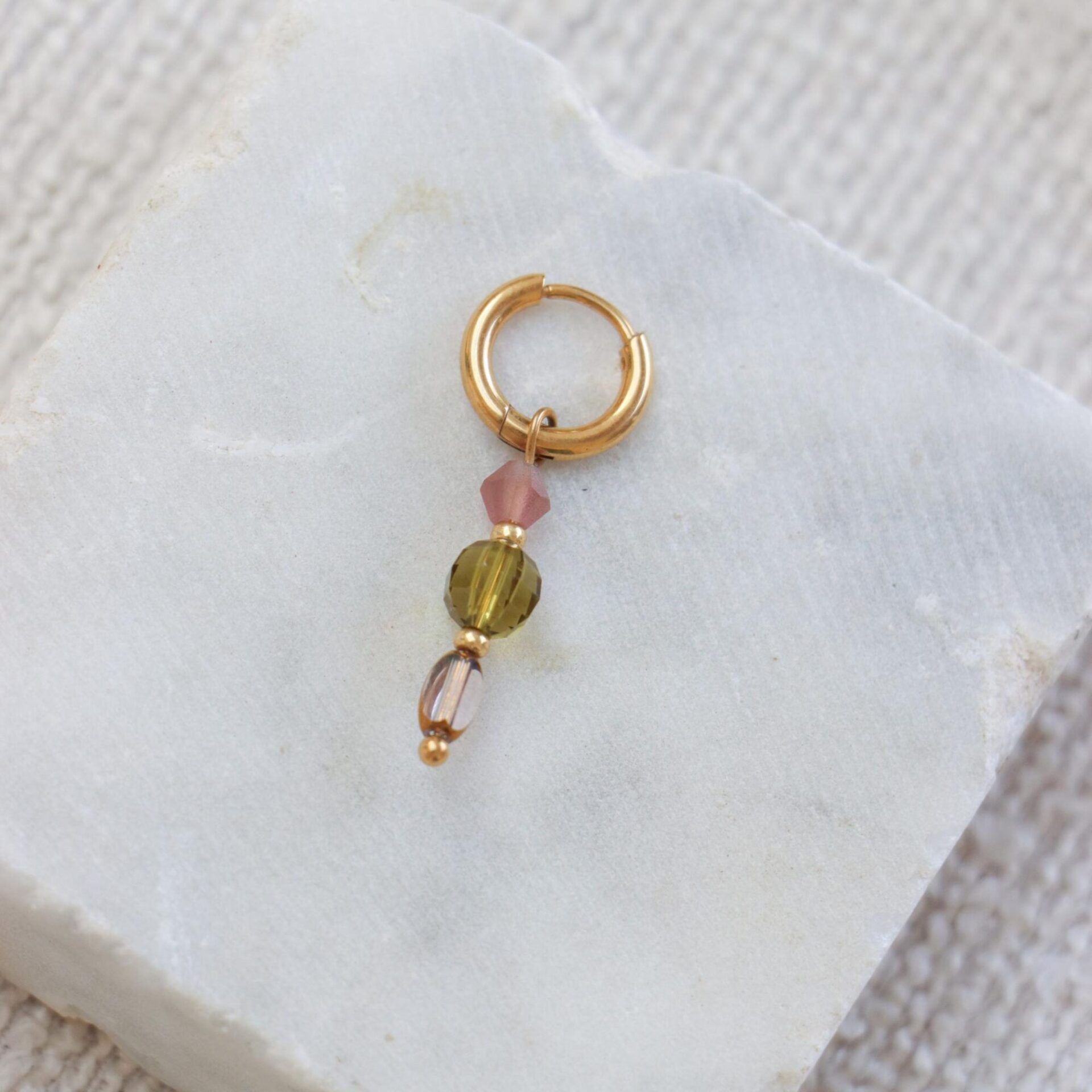 Prachtige oorbel met een mix van groen/roze kralen.